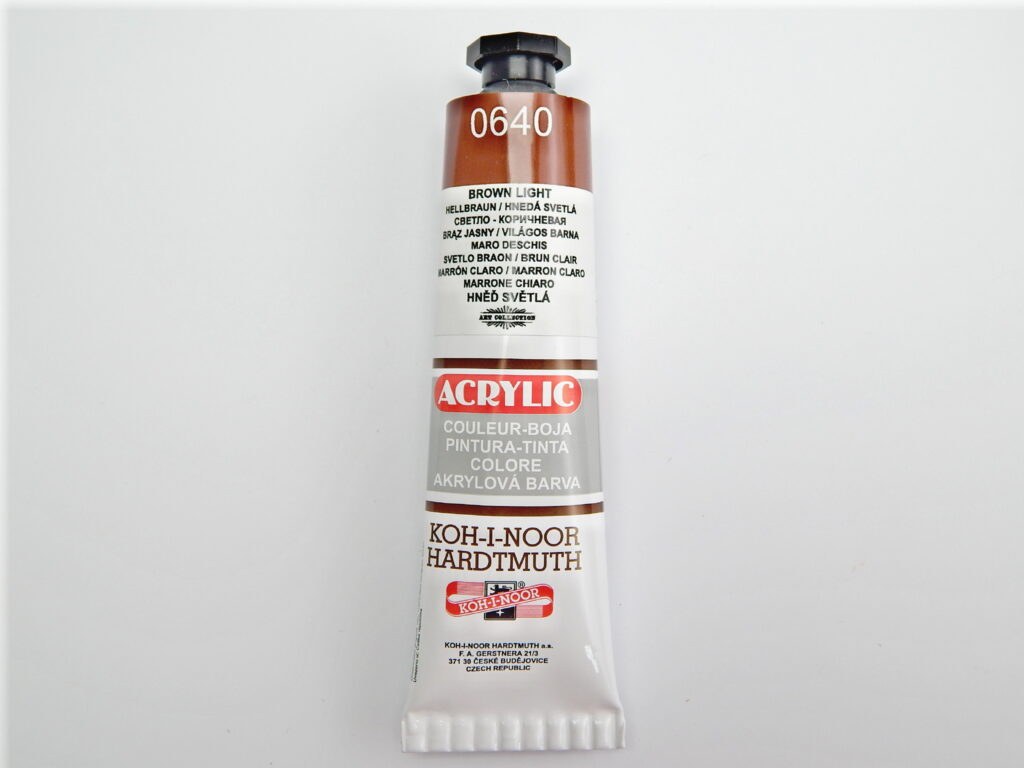 barva akrylová 40ml hněď světlá Jedná se o vodou ředitelné disperzní barvy vysoké kvality. Lze je nanášet štětcem, válečkem nebo špachtlí na jakýkoliv nemastný podklad. Barvy se vyznačují vysokým obsahem pigmentu a barevnou světlostálostí. Po zaschnutí vytvoří pružný nekřehnoucí film odolný vůči stárnutí.Mezi další výhody těchto barev patří také vzájemná mísitelnost a krátká doba zasychání.Vyrábí se ve 32 odstínech.