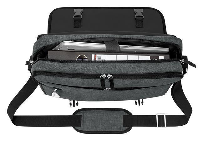 Vlastnosti: hlavní přihrádka; 2 kapsy a 1 měkká polstrovaná kapsa pro notebook; přední kapsa s kabelovým vstupem; zadní kapsa; kapsy se zapínáním na zip; klopa tašky se zapínáním pomocí přesek; nastavitelný ramenní popruh; snadné na údržbu;