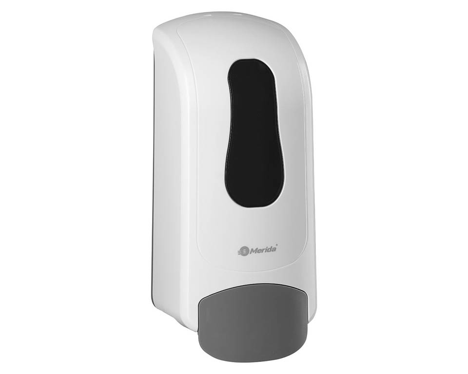 ergonomický dávkovač mýdlové pěny vyrobený z kvalitního abs plastu v bílé barvě, dávkuje jemnou krémovou pěnu, kapacita výměnných kazet 700 g poskytuje více než 2 200 porcí, uzamykatelný na klíček, ideální pro veřejné budovy, rozměry: 27 × 12 × 10,4 cm