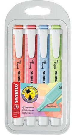 Nová kolekce zvýrazňovačů STABILO swing cool Pastel je ideální pro lifestylově orientové teenagery, školáky, studenty a pro všechny, kteří tráví hodně času na cestách. Tyto ploché zvýrazňovače kapesní velikosti ve 4 jemných, trendy pastelových odstínech, které doplňuje víčko s praktickým klipem, jsou k dispozici pouze omezenou dobu.