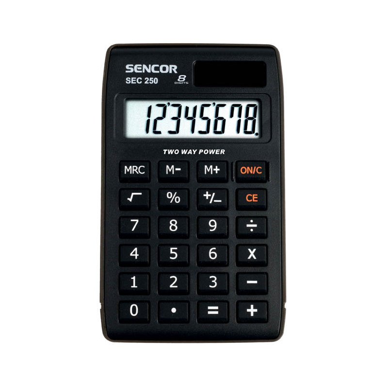 Popis k výrobku: Kalkulačka Sencor SEC 250 displej 8 míst stolní kalkulačka s velkým 8místným displejem, výpočet procent a odmocniny, označení tříčíslicové čárky, 3tlačítková paměť, nezávislá paměť, duální napájení, rozměry 98 × 60 × 8 mm, hmotnost 42 g