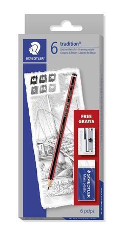 Popis k výrobku: Grafitové tužky Tradition, 6 tvrdostí, pryž, ořezávátko, STAEDTLER 61 110 C6