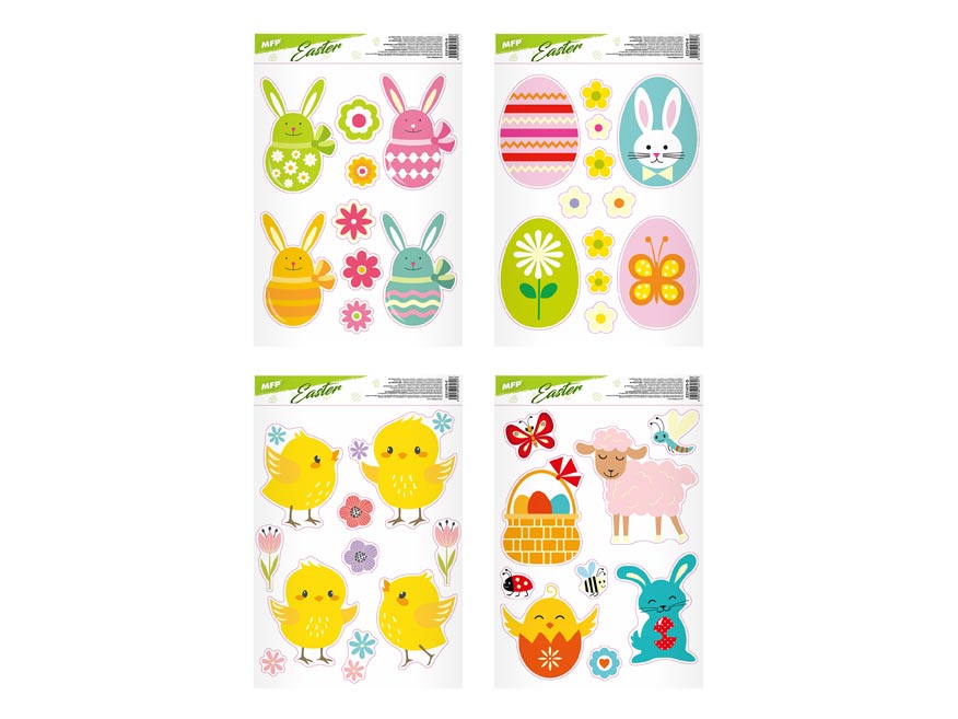 Okenní fólie bez lepidla - velikonoční kuřátka, vajíčka, zajíčci - Vyzdobte si okno těmito krásnými samolepkami na okno. Vytvoří Vám kouzelnou atmosféru domova. NÁVOD: Sloupněte obrázek z podložky a umístěte na čisté, případně navlhčené sklo stranou, která byla na podložce. Obrázek elektrostaticky přilne. Folie se snadno sloupne a dá se přemístit. Cena za 1 ks, dodáváme v mixu po 4 ks dle skladové zásoby.