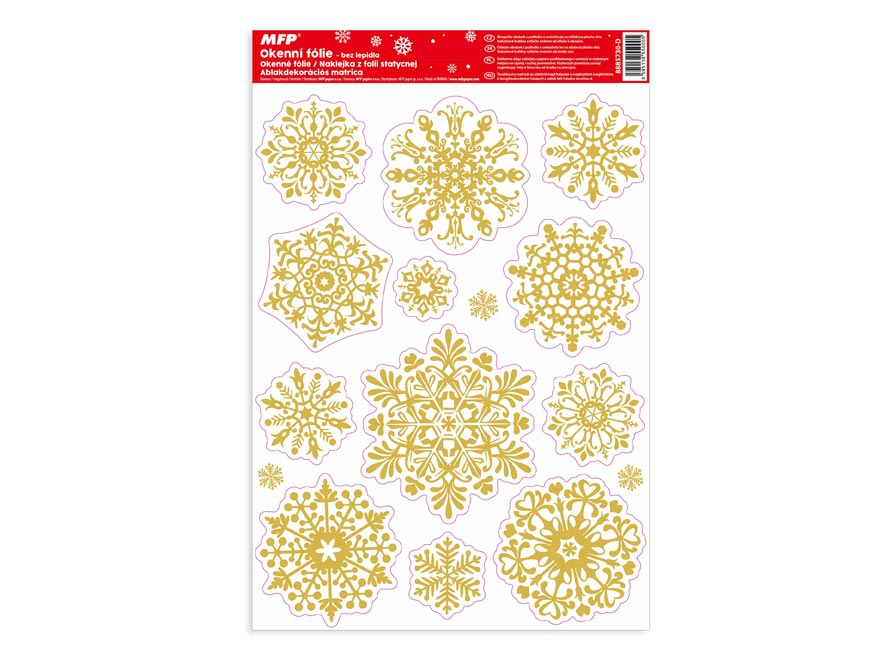 Okenní fólie vánoce s motivy vloček (zlaté) - Vyzdobte si okno těmito krásnými samolepkami na okno. Vytvoří Vám kouzelnou atmosféru domova. NÁVOD: Sloupněte z podložky obrázek a umístěte na čisté, případně navlhčené sklo stranou, která byla na podložce. Obrázek elektrostaticky přilne. Fólie se snadno sloupne a dá se přemístit. Uvedená cena je za 1 ks, dodáváme v mixu po 4 ks dle skladové zásoby.