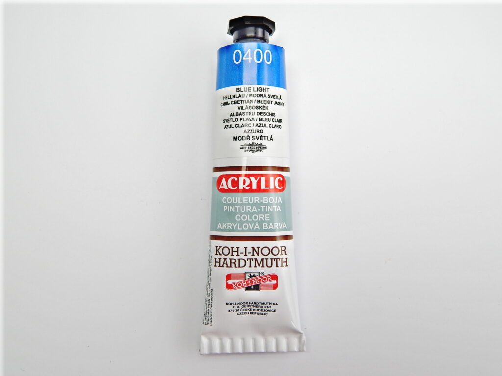 barva akrylová 40ml modř světlá Jedná se o vodou ředitelné disperzní barvy vysoké kvality. Lze je nanášet štětcem, válečkem nebo špachtlí na jakýkoliv nemastný podklad. Barvy se vyznačují vysokým obsahem pigmentu a barevnou světlostálostí. Po zaschnutí vytvoří pružný nekřehnoucí film odolný vůči stárnutí.Mezi další výhody těchto barev patří také vzájemná mísitelnost a krátká doba zasychání.Vyrábí se ve 32 odstínech.