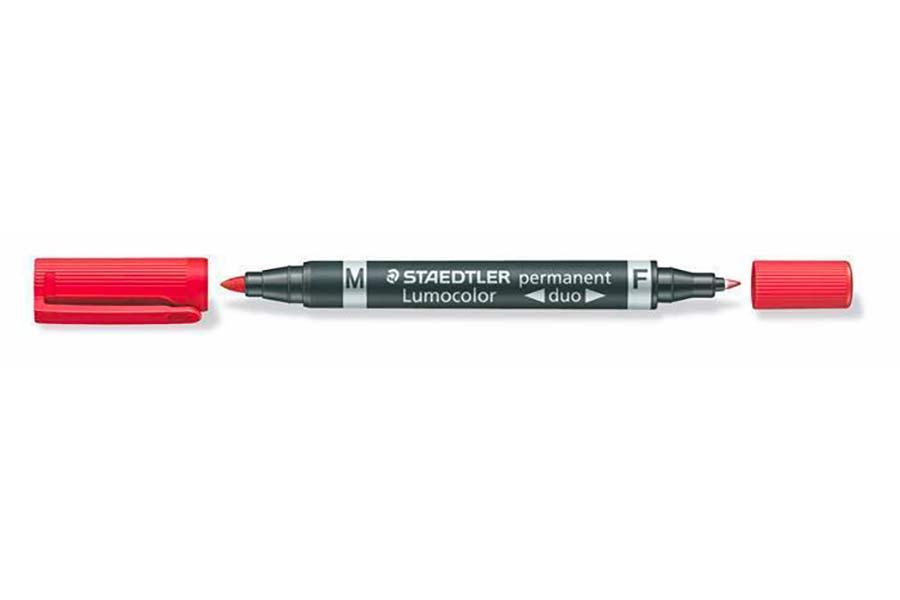 Popis k výrobku: Permanentní popisovač Lumocolor 348 Duo, červená, kuželový hrot, F/M, oboustranný, STAEDTLER