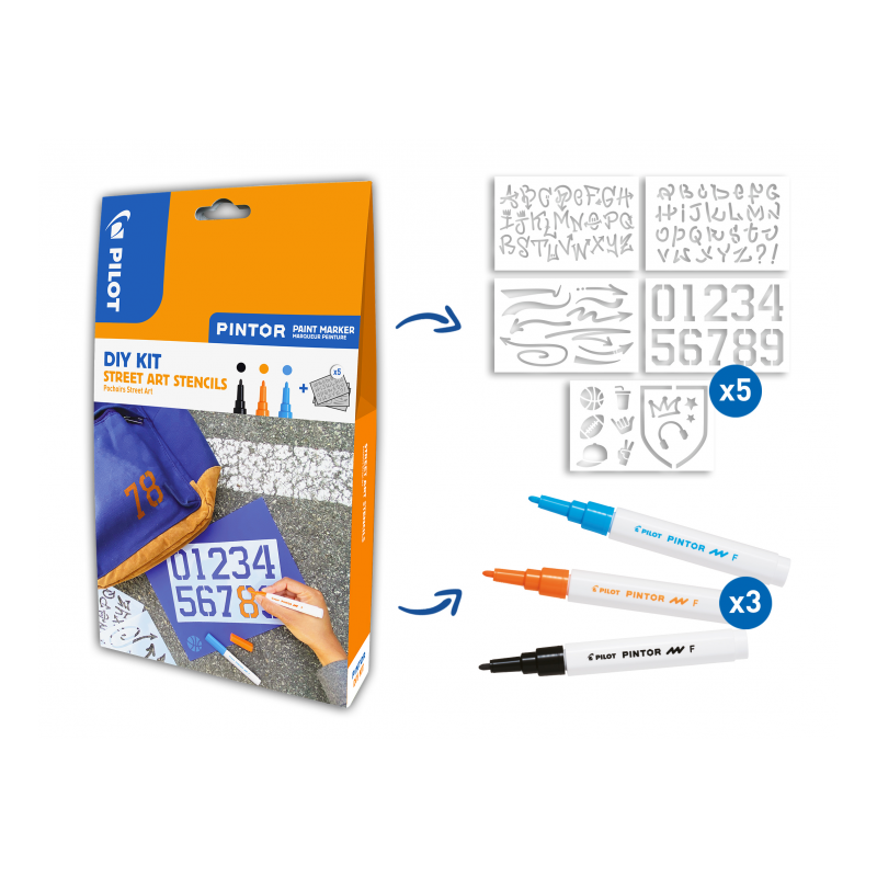 Akrylový popisovač Pintor, který píše téměř na všechny povrchy. Sada v dárkovém sáčku obsahuje: 1 x Pintor (hrot Fine): černá, oranžová, světle modrá + 5 x šablona s různými motivy pro snadné zdobení. Vysoce odolný vláknový hrot, inkoust na vodní bázi s akrylovými složkami a vysokým obsahem pigmentů, vodě a světlu odolný. Vysoká krycí schopnost, mix barev. Permanentní v závislosti na povrchu a dalším ošetření stopy (např. ošetření bezbarvým lakem, přežehlení, fixace vysokou teplotou atd.). Neskladujte hrotem dolů. Průměr hrotu: 2,9 mm, šířka stopy: 1,5 mm.