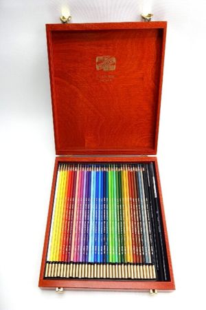 Souprava 36 ks AKVARELOVÝCH barevných pastelek + 2 štětce v dřevěné kazetě. Pastelky jsou šestihranné s kvalitním silně pigmentovaným jádrem o průměru 3,8 mm. Tužky mají špičkovou povrchovou úpravu, máčený knoflík a zlaté značení. Vyznačují se sytou barevnou stopou s možností kresbu dále upravovat rozmýváním pomocí štětce, případně houbičky. Jsou vhodné pro umělecké a hobby kreslení.
