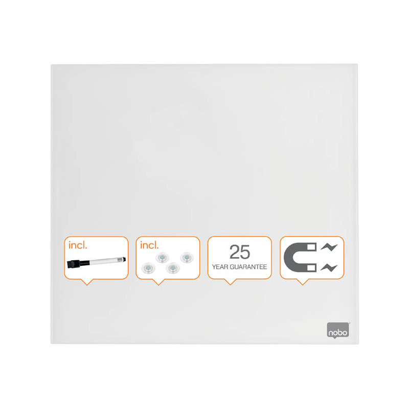 širokoúhlý formát poskytuje dostupnější psací plochu oproti klasickým skleněným tabulím, kde častokrát zůstává spodní a horní část nevyužita, stylový moderní bezrámový design, který maximalizuje využitelnou plochu na psaní, bezpečnostní tvrzené sklo s magnetickým povrchem s vynikající mazatelností a nejvyšší odolností proti šmouhám, skvrnám od inkoustu, škrábancům a promáčknutí, dodáváno s popisovači Nobo pro suché stírání a sadou extra silných magnetů pro skleněné tabule Nobo, 25 let záruka