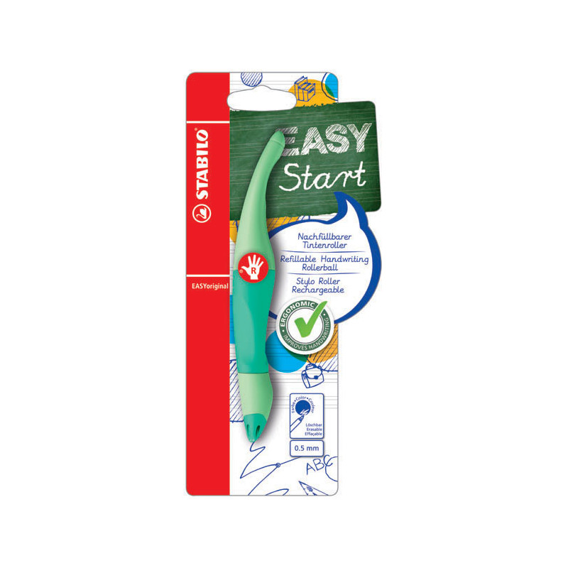 STABILO EASYoriginal ergonomický roller je nyní také dostupný v trendy jemných pastelových odstínech. Praváci si mohou vybrat mezi obláčkově modrou, pastelovou růžovou, pastelovou fialovou a pastelovou zelenou a leváci mezi obláčkově modrou a pastelovou růžovou. Díky neklouzavé úchopové zóně padne roller pohodlně do dětské ruky. Snadná manipulace podporuje nadšení při psaní. Kaňky a škrábance jsou problémem minulosti – začínající písaři benefitují ze snadné manipulace. To znamená nekonečná zábava s perem a čistý a úhledný rukopis. Každá nová náplň má i nový hrot, náplně lze měnit snadno a rychle tak, abyste mohli hned pokračovat ve psaní. Náhradní náplně jsou dostupné v šířce stopy „fine“ (modrý zmizíkovatelný inkoust, 0.3mm šířka stopy) a „medium“ (modrý zmizíkovatelný, černý, červený, 0.5mm). Na konci pera je praktický štítek na jméno.