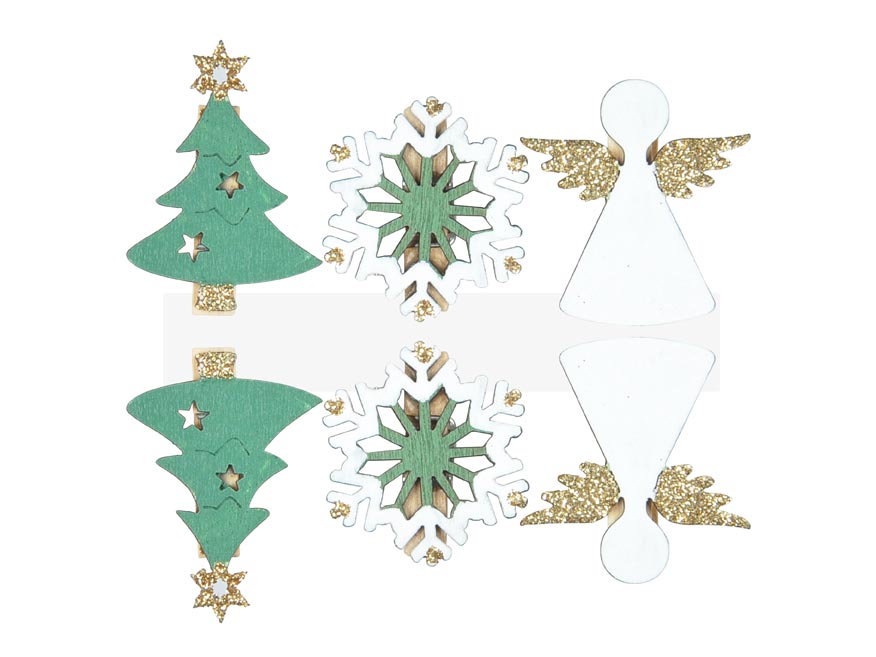 Kolíček dřevěný andělé Vánoční dřevěná dekorace - Stromeček, vločka a anděl nalepený na kolíčku, ozdobí váš vánoční dárek, přáníčka nebo je můžete kamkoliv jinam připnout a ozdobit tak váš interiér. Balení obsahuje: 2 ks vánočních stromečků, 2 ks vloček a 2 kusy andělů. Délka ozdoby: 4,8cm