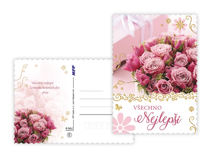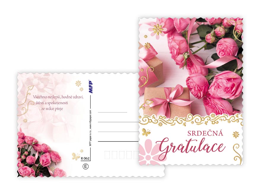 Pohlednice s květinovým motivem. Text obsahují na zadní straně 3 pohlednice z 6. Text na přední straně: Srdečné blahopřání, Srdečná gratulace, Všechno nejlepší Text na zadní straně: Pohlednice 1: Všechno nejlepší a mnoho krásných dní přeje Pohlednice 2: Všechno nejlepší, hodně zdraví, štěstí a spokojenosti ze srdce přeje Pohlednice 3: Hodně stěstí, zdraví a radosti přeje Pohlednice 4-6 bez textu Papír: pohlednicový karton 240 g Povrchová úprava: UV lak, glitter Text: 3/6 Uvedená cena je za 1ks. Dodáváme v mixu po 6 ks dle skladové zásoby.