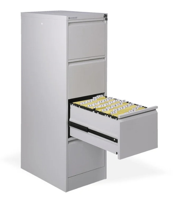 kartotéka, 4 zásuvková, pro závěsné pořadače formátu A4, centrální uzamykání všech zásuvek, plný 100% výsuv zásuvek, přesné teleskopické vedení, kuličková ložiska pro lehký a tichý chod, zařízení proti převážení kartotéky, zábrany proti vypadnutí zásuvek, nosnost jedné zásuvky 40 kg, šířka 41,6 cm, výška 132 cm, hloubka 62 cm