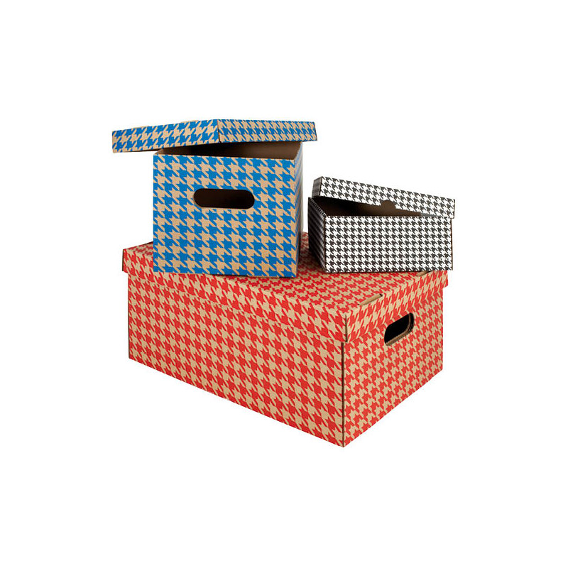 krabice jsou vyrobeny ze zpěvněné třívrstvé vlnité lepenky, potisk kohoutí stopa v bílé barvě, pevná konstrukce umožňuje snadné stohování a stěhování, vhodné pro uložení a skladování různých dokumenů, drobností, hraček, dodáváno v rozloženém stavu, nosnost 30 kg