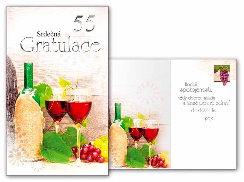 Přání k 55. narozeninám s textem - Oslavy narozenin patří k výjimečným a příjemným okamžikům v životě. Potěšte oslavence a spolu s dárkem mu věnujte originální a krásné přáníčko, které mu bude připomínat tuto radostnou událost. Přání je s obrázkem vína a skleniček. Text na přední straně přání: 55 srdečná gratulace Text uvnitř přání: Hodně spokojenosti, vždy dobrou náladu a hlavně pevné zdraví do dalších let přeje Papír: pohlednicový karton 240 g Přání je baleno v sáčku, součástí balení je i dopisní obálka.