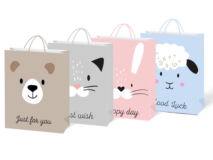 Barevná, dárková, papírová taška M LUX s motivem obličeje zvířátka. Taška je opatřena pevným uchem pro snadné nošení a kartičkou kam můžeme napsat jméno nebo krátké věnování. Dárkové tašky jsou skvělé na dárky, které lze jen těžko zabalit do balícího papíru. Velmi praktické jsou také pro ty, co dárky neradi balí nebo to moc neumí a nebyli by spokojeni se svým výsledkem. Barva: hnědá, šedá, růžová, modrá Motiv: obličej zvířátka Rozměr: 180 x 240 x 80 mm Dodáváme v mixu po 4 ks dle skladové zásoby. Uvedená cena je za 1 ks
