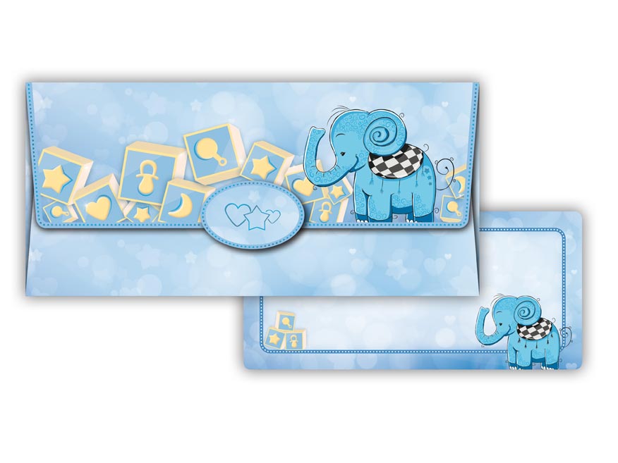Dárková obálka na peníze s motivem pro miminka - Udělejte novopečeným rodičům radost a věnujte jim obálku s penězi. Uvnitř je kartička bez textu, na kterou můžete napsat věnování. PROVEDENÍ: modrá se slonem, vhodná pro malého chlapečka Uvedená cena je za 1 ks. Dodáváme v plastovém sáčku se závěsem.