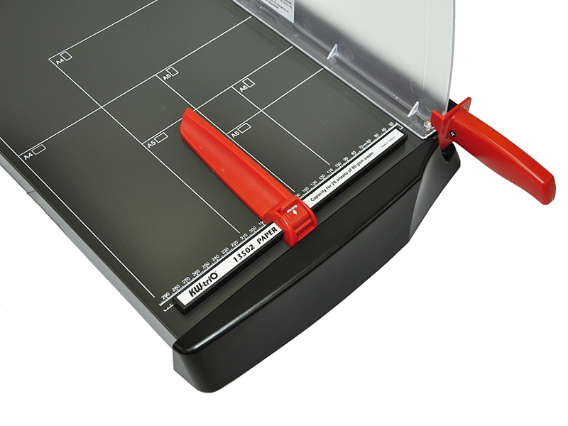 pákové řezačky s kovovým povrchem a robustním uložením broušeného plechového nože s plastovým ochranným krytem a dorazovou lištou s aretací, s vyznačenými měřítky a DIN formáty., KW 13500 - formát A4, délka řezu je 343 mm a maximální kapacita 20 listů (70g/m), velikost pracovního stolu 473 x 337 mm, KW 13502 – formát A3, délka řezu je 449 mm a maximální kapacita 20 listů (70g/m, velikost pracovního stolu 576 x 323 mm