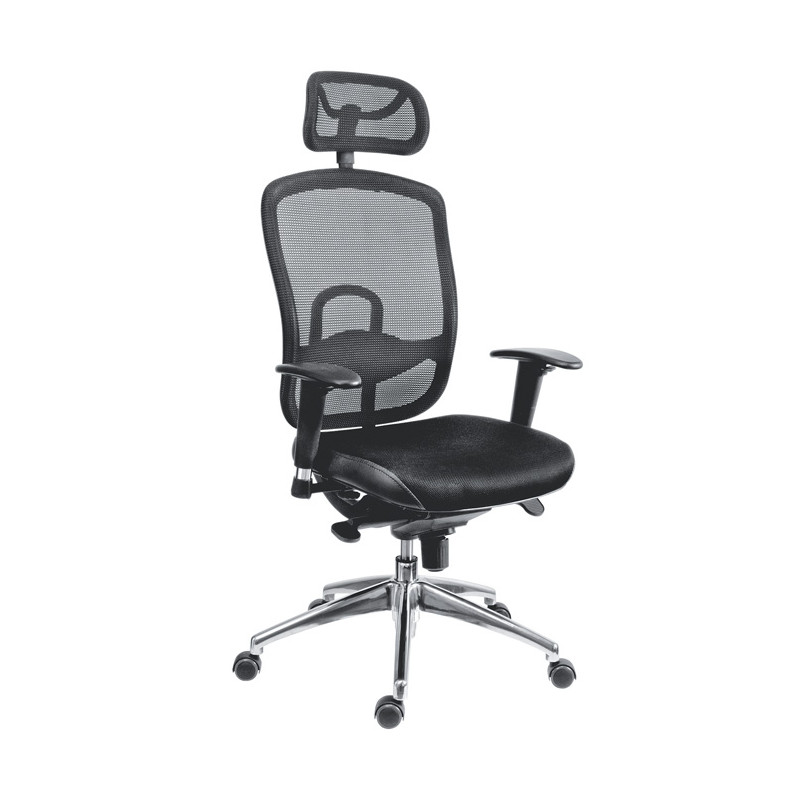 pracovní židle s prodyšným opěrákem a opěrkou hlavy, synchronní mechanismus s nastavením síly protiváhy a několikanásobnou aretací, bederní regulovatelná opěrka, svisle a vodorovně nastavitelné područky s měkkou dotykovou plochou, aluminiová leštěná báze, kolečka s gumovou obručí pro všechny typy povrchů, nosnost 130 kg, celková výška: 123-135 cm, šířka: 67,5 cm, hloubka sedáku 50 cm, výška sedáku: 44,5-53,5 cm