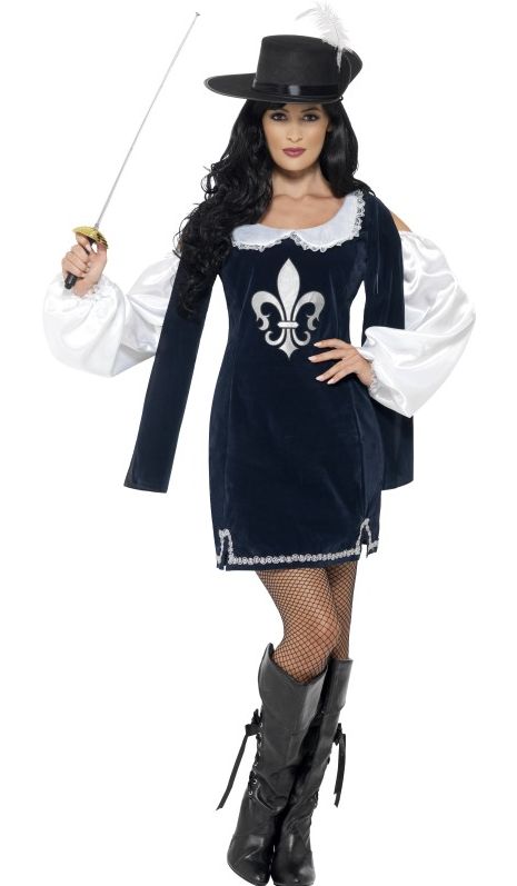 Součástí kostýmu jsou šaty a klobouk. Tmavomodré krátké úzké šaty mají dlouhé široké spadené bílé rukávy. Kolem výstřihu je bílý límeček zdobený bílou krajkou. Na ramenou jsou přišity volně visící pásy modré látky. Na hrudníku je velký stříbrný mušketýrský znak. Spodní lem je zdoben bílou krajkovou stužkou. Sukně má dva malé rozparky po stranách. Kostým doplňuje černý mušketýrský klobouk s bílým pérem.