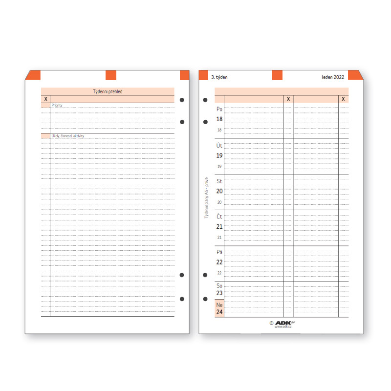 Popis k výrobku: Náhradní vložky do diářů ADK - A6 / týdenní pravý Termínovaný formulář pro týdenní plánování pravý do diářů ADK formátu A6, 53 listů (1 list pro každý týden), levá strana od mechaniky: volné řádky na poznámky, pravá strana od mechaniky: přehled celého týdne (pondělí – neděle), rozměry 16 x 10,5 cm.