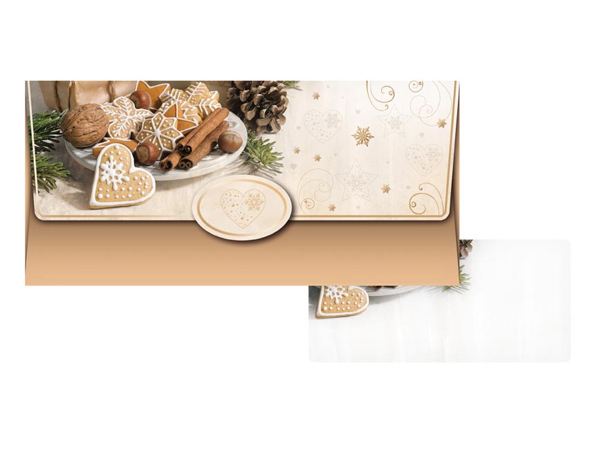 Dárková obálka na peníze s vánočním motivem a uzavíratelnou klopou. Darujte svým blízkým dárek k Vánocům v podobě obálky na peníze. Do obálky lze vložit peníze nebo dárkový poukaz. Uvnitř je kartička bez textu, na kterou můžete napsat věnování. BARVA: světle hnědá / béžová MOTIV: perníčky, skořice, oříšky Dodáváme v plastovém sáčku. Uvedená cena je za 1 ks.