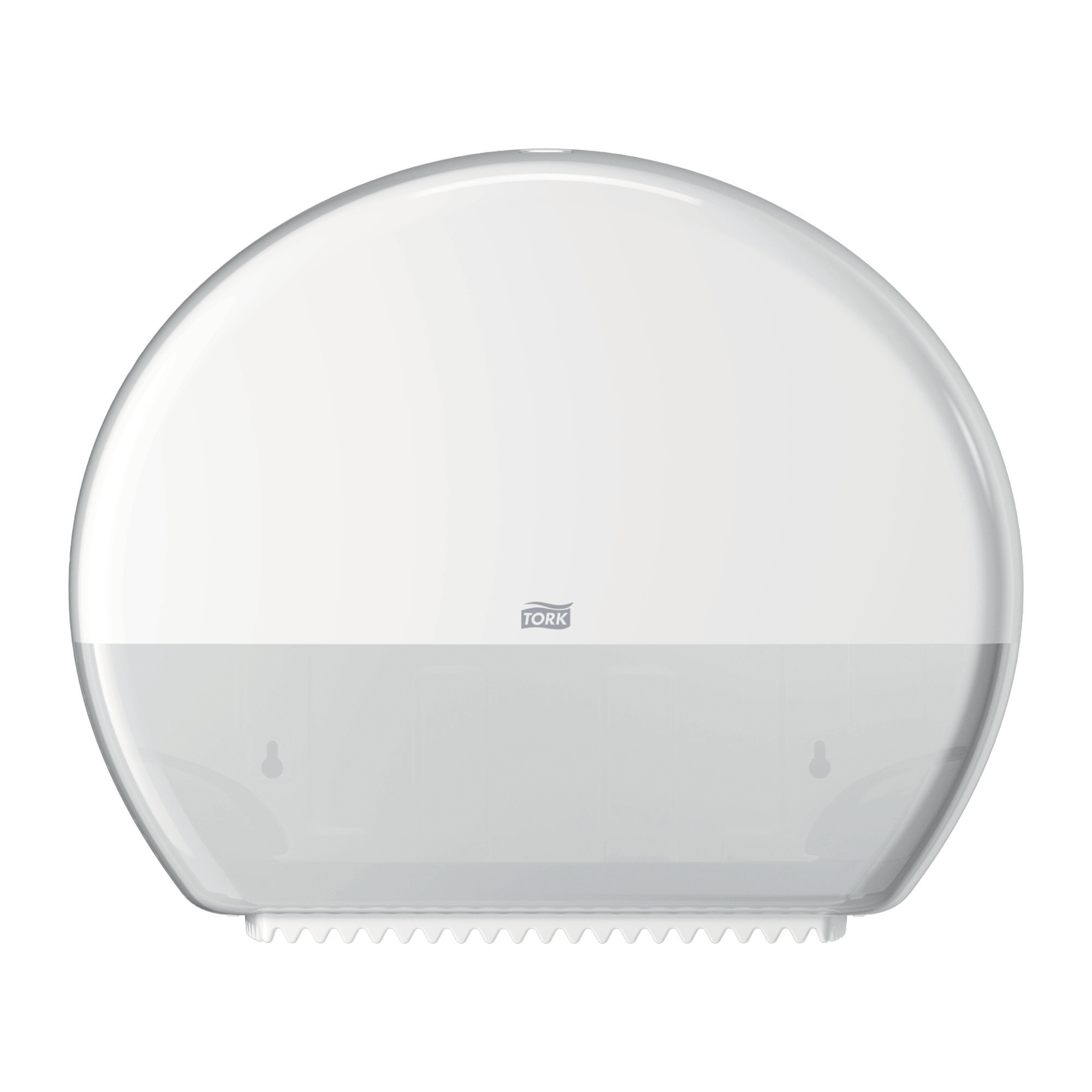 Tork T1 systém zásobník na jumbo role v designu elevation, vyrobený z odolného bílého abs plastu, uzamykatelný, určený pro maxi toaletní papíry o průměru až 260 mm, snadné doplňování a spolehlivé dávkování, rozměry: 360 × 437 × 133 mm