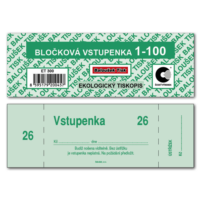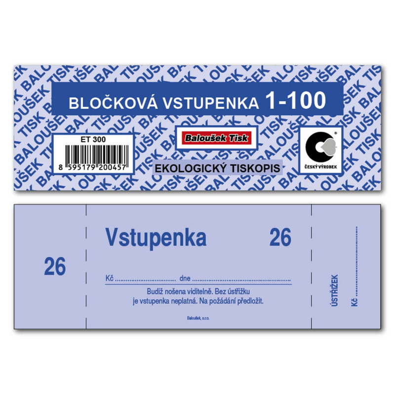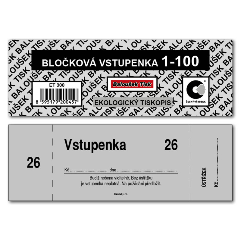 Bločkové vstupenky Baloušek 133 x 39 mm / 1-100 / 4 odstíny barev / ET300