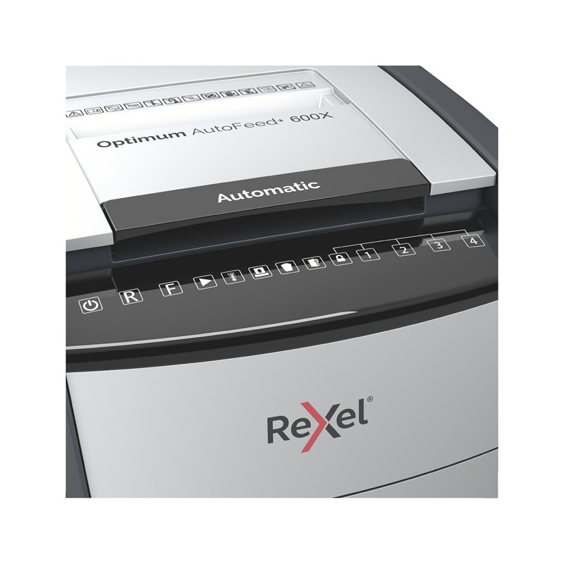 Skartovací stroj Rexel Auto+ Optimum 600X je výkonné řešení pro kanceláře, které automaticky podává až 600 listů A4 (80 g/m²) najednou a skartuje je křížovým řezem s úrovní zabezpečení P-4. Otevřením manuálního otvoru lze vložit až 15 listů. Disponuje objemným vyjímatelným košem 110 l, infračerveným senzorem detekce plného koše, tichým provozem (~55 dB) a technologií proti zaseknutí papíru. Provozní cyklus je až 240 minut v kuse, poté je doporučen chladicí ventilátor. Vstupní otvor má šířku až 230 mm a typ řezu křížový: 4 × 30 mm. Dotykový ovládací panel umožňuje snadné nastavení a stroj zvládne skartovat i kreditní karty, kancelářské sponky a drátky ze sešívaček.