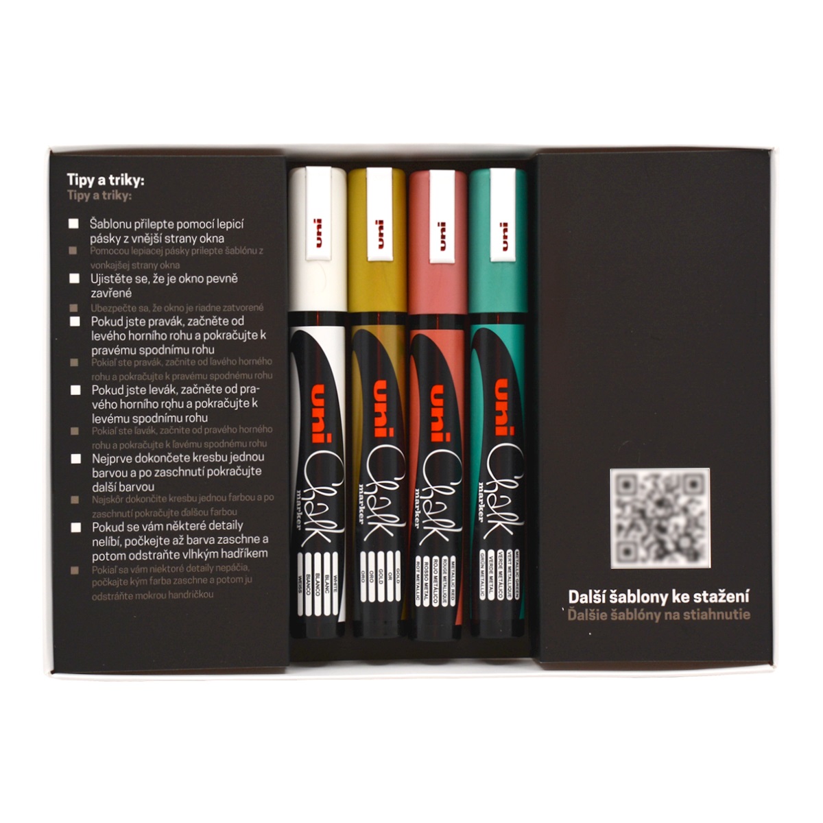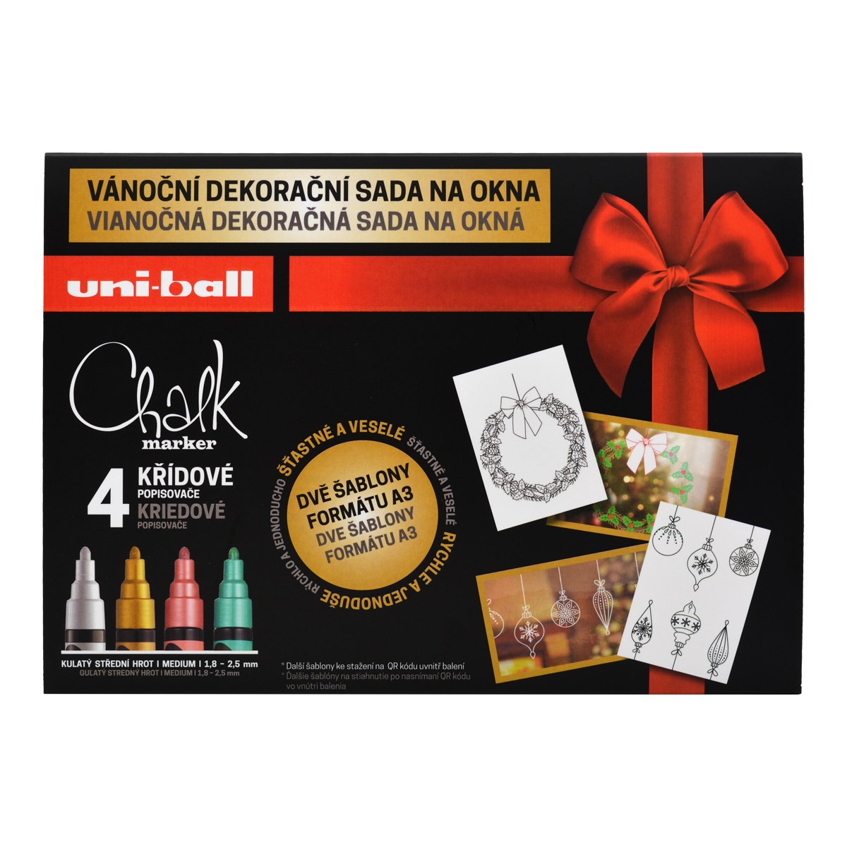 Popis k výrobku: Sada křídových popisovačů UNI Chalk Marker - Vánoční sada 4 ks + 2 šablony