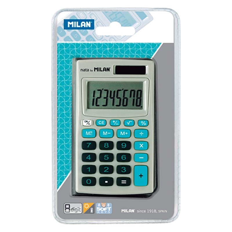 Kapesní 8-místná kalkulačka MILAN 150208 v ochranném obalu. Kalkulačka má kumulovanou paměť výsledků a výpočet odmocniny. Kalkulačka má měkké gumové tlačítka a duální napájení: 1,5 V baterie + solární panel. Šedá kalkulačka s modrými detaily.