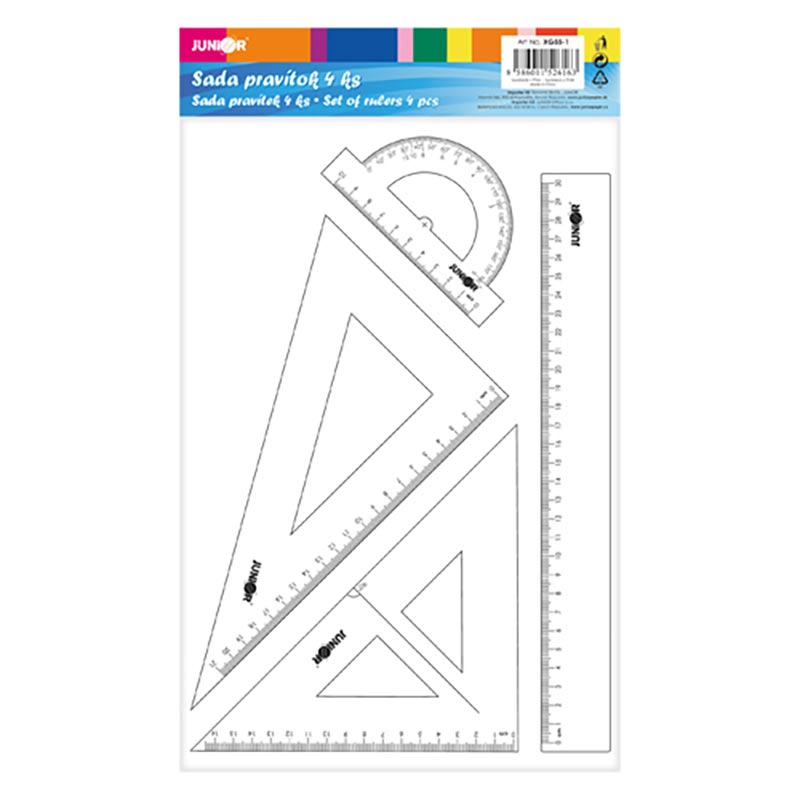 4-kusová rýsovací sada pravítek, vyrobená z transparentního plastu. Součástí soupravy je trojúhelník s ryskou 17cm, pravoúhlý trojúhelník 24cm, pravítko 30cm / 12inch, a úhloměr 10cm. Baleno v plastovém pouzdru. Kvalitní, cenově dostupná sada, kterou firm