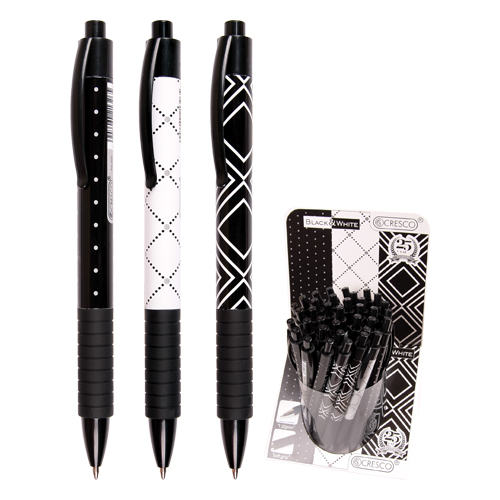 Guľôčkové pero s plastovým telom a ergonomicky tvarovaným gumovým úchopom. Pero má príjemné vyhotovenie s pogumovaným povrchom. Náplň modrá, šírka hrotu 1.00 mm. Dizajn: Black and White.