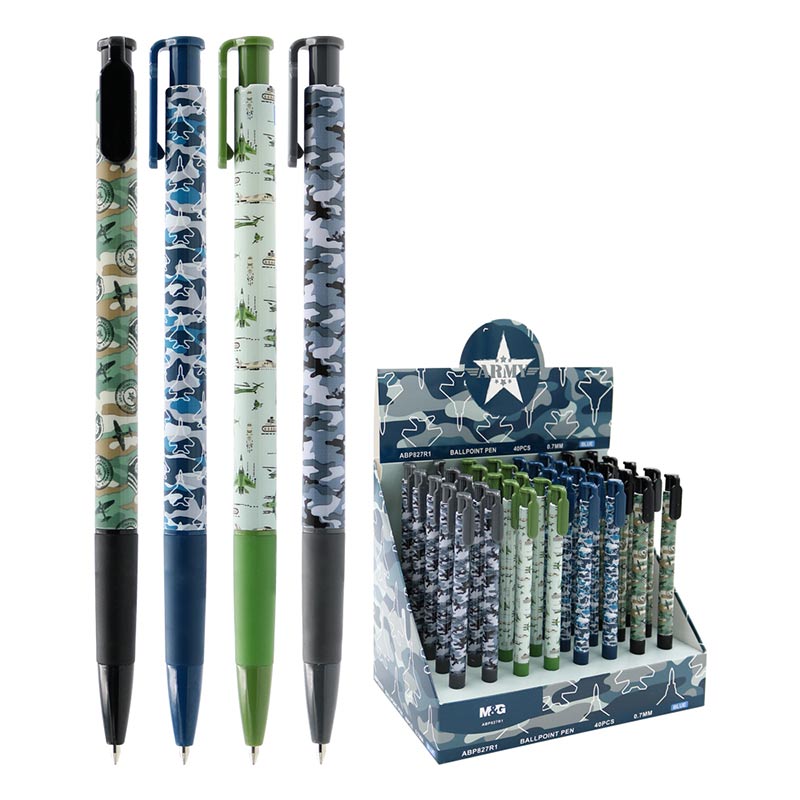 Klasické kuličkové pero od značky M&G, kategorie Army. Plastové tělo s příjemným gumovým úchopem pro držení. Barva inkoustu je modré barvy, stopa kuličky je 0,7 mm.