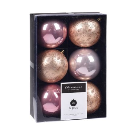 Vánoční koule - sada 6 ks odstíny růžové o průměru 80 mm, mix lesklá/matná dekorovaná. Materiál: plast