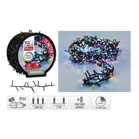 Popis k výrobku: Dekorační osvětlení vnějšek. - řetěz 750 LED barevné, délka 15 m /230V 750x LED: 5 mm vícebarevné - vzdálenost jen 2 cm mezi LED, vodiče jsou zelené barvy.