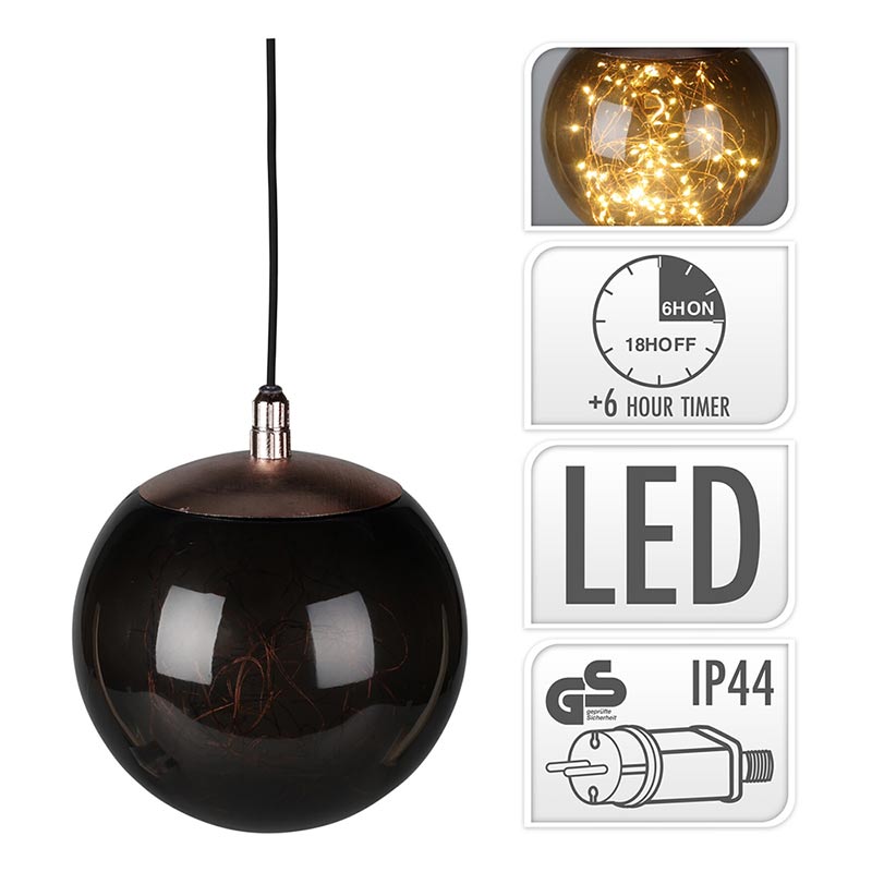Svítící koule s 80 mikro LED (bílá teplá), určené k zavěšení do interiéru - exteriéru. - kouřovo-šedé tělo koule se zlatým vrchem - napájecí adaptér 230V, ochrana IP44 - přívodní vodič 500cm Časovač: svítí 6 hod. / nesvítí 18 hod.