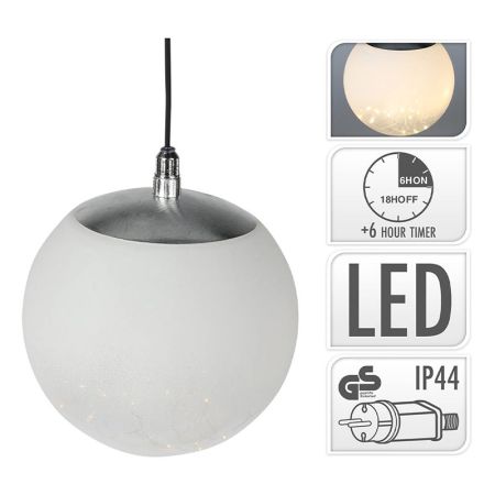 Svítící koule s 80 mikro LED (bílá teplá), určené k zavěšení do interiéru - exteriéru. - bílé tělo koule se stříbrným vrchem - napájecí adaptér 230V, ochrana IP44 - přívodní vodič 500cm Časovač: svítí 6 hod / nesvítí 18 hod Stmívač: nastavení intenzity světla ve 4 krocích