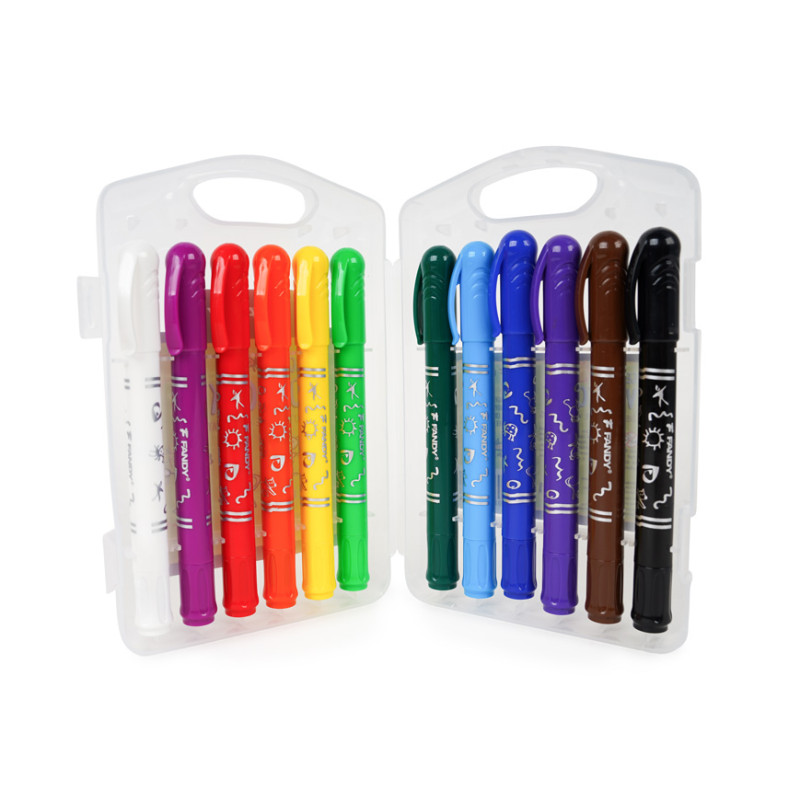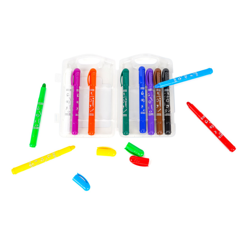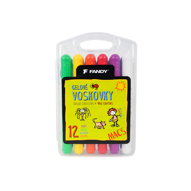 Popis k výrobku: Voskové gelové pastelky - 12 barev sada 12 kusů gelových voskovek v praktickém plastovém pouzdru, otočný mechanismus vyjíždění voskovky z plastového těla, zářivé barvy, vypratelné, mnohostranné využití, jako voskovky, tempery, vodovky