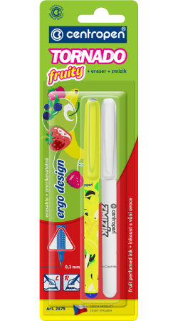 TORNADO fruity ve zcela novém , atraktivním designu a s osvědčeným ERGO držením a "masážními body", které aktivují na bříškách prstů hmatové receptory a garantují zdravé psaní bez únavy. Vhodná náhrada plnicích per pro školáky, píše lehce bez tlačení, ideální pro praváky, leváky i dysgrafiky, doporučeno pro první dětské psaní. Nový zmizíkovatelný modrý nepropíjivý inkoust, u kterého si v provedení fruity mohou děti vybrat z pěti nových příjemných ovocných vůní (banán, jablko, jahoda, malina, borůvka), zaručuje velmi dlouhou, tenkou a rovnoměrnou stopu písma. Průměr kuličky 0,5 mm, šíře stopy 0,3 mm. + Zmizík na inkousty do plnících per s trojúhelníkovou úchopovou částí. Válcový hrot, šíře stopy 1 mm, odolný proti zatlačení. Ventilační chránítko.