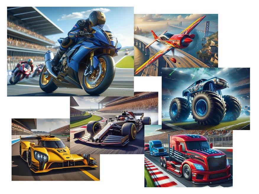 Pohlednice s motivy různých závodních prostředí (motorky, letadlo, formule…). Pohlednice jsou bez textu na zadní straně. Text: 0/6 Povrchová úprava: UV lak Papír: pohlednicový karton 240 g Dodáváme v mixu po 6 ks dle skladové zásoby. Uvedená cena je za 1 ks.