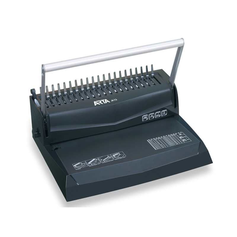 elegantní kancelářský stroj pro vázání dokumentů do plastových hřbetů s kapacitou 12 listů, je vybaven oddělenými pákami pro děrování a roztažení kroužku, najednou prosekne až 12 listů (21 otvorů) a sváže 450 listů, nastavitelný postranní doraz pro nastavení přesného vycentrování, nastavitelná hloubka prosekávání 2-5 mm pro optimální výsek dle síly dokumentu, snadno vysypatelná odpadní zásuvka, pro formát A4, rozměry: 350 x 275 x 150 mm