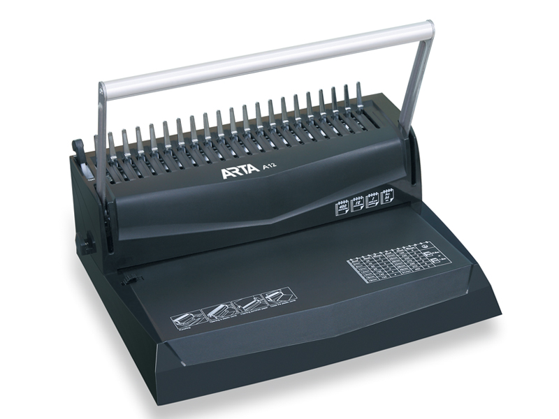 elegantní kancelářský stroj pro vázání dokumentů do plastových hřbetů s kapacitou 12 listů, je vybaven oddělenými pákami pro děrování a roztažení kroužku, najednou prosekne až 12 listů (21 otvorů) a sváže 450 listů, nastavitelný postranní doraz pro nastavení přesného vycentrování, nastavitelná hloubka prosekávání 2-5 mm pro optimální výsek dle síly dokumentu, snadno vysypatelná odpadní zásuvka, pro formát A4, rozměry: 350 x 275 x 150 mm
