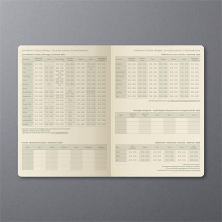 Stylový diář je uzavíratelný na gumičku, vybavený praktickou papírovou kapsou na zadní straně a poutkem na pero. Jazyk: D/GB/F/NL (ne v CZ)