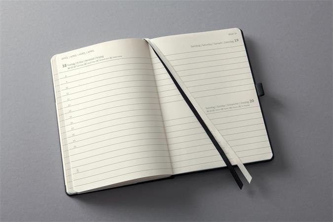 Stylový diář je uzavíratelný na gumičku, vybavený praktickou papírovou kapsou na zadní straně a poutkem na pero. Jazyk: D/GB/F/NL (ne v CZ)