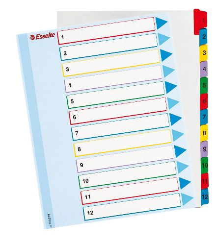 Zosilnené rozraďovače Esselte Mylar rozšíreného formátu A4 Maxi z kvalitného, silného kartónu, jednotlivé stránky v rôznych farbách. Na číselné triedenie dokumentov. Multiperforácia umožňuje použitie rozlišovača v krúžkovom aj pákovom poradači. Titulný list s možnosťou opakovaného popisu. Jednoduchá orientácia v zakladaných dokumentoch. Formát A4 Maxi umožňuje využitie rozraďovača pri ukladaní dokumentov v prospektových obaloch.