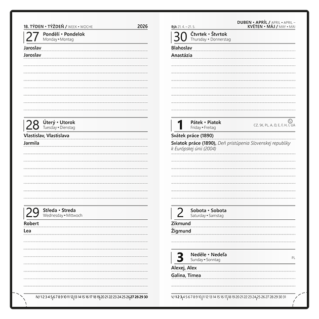 povrch diáře příjemný na dotek, zářivé barvy, moderní design, české a slovenské jmenné kalendárium, dny a měsíce v 5 jazycích (CZ, SK, ANG, D, R), mezinárodní svátky, měsíční fáze, roční období, letní a zimní čas, místo na poznámky, formát 7,5 x 15 cm