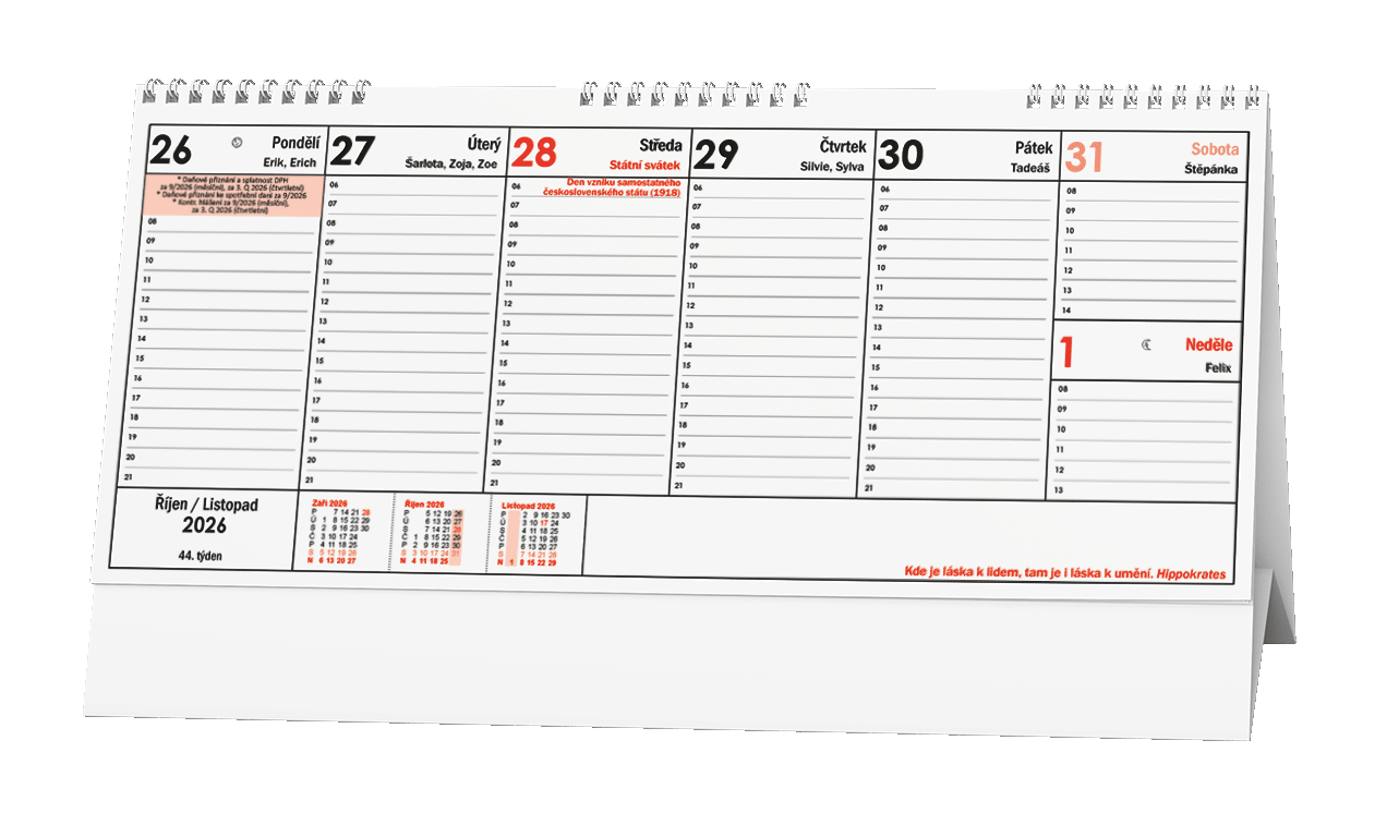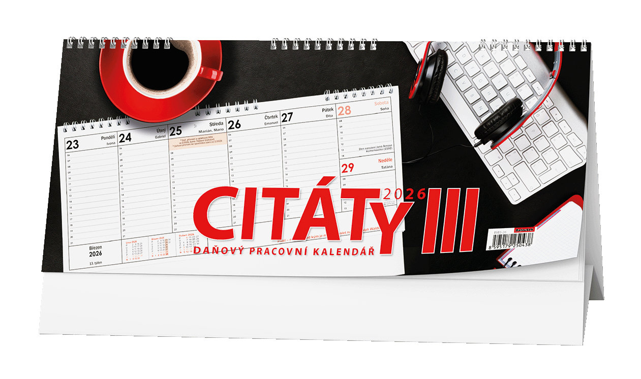 Popis k výrobku: Kalendář stolní pracovní Citáty III. / BSB3 nejprodávanější pracovní kalendáře, české týdenní jmenné kalendárium, měsíční fáze, roční období, zimní a letní čas, daňové termíny, doplněný citátem na každý týden, formát 32 x 14 cm, 57 stran