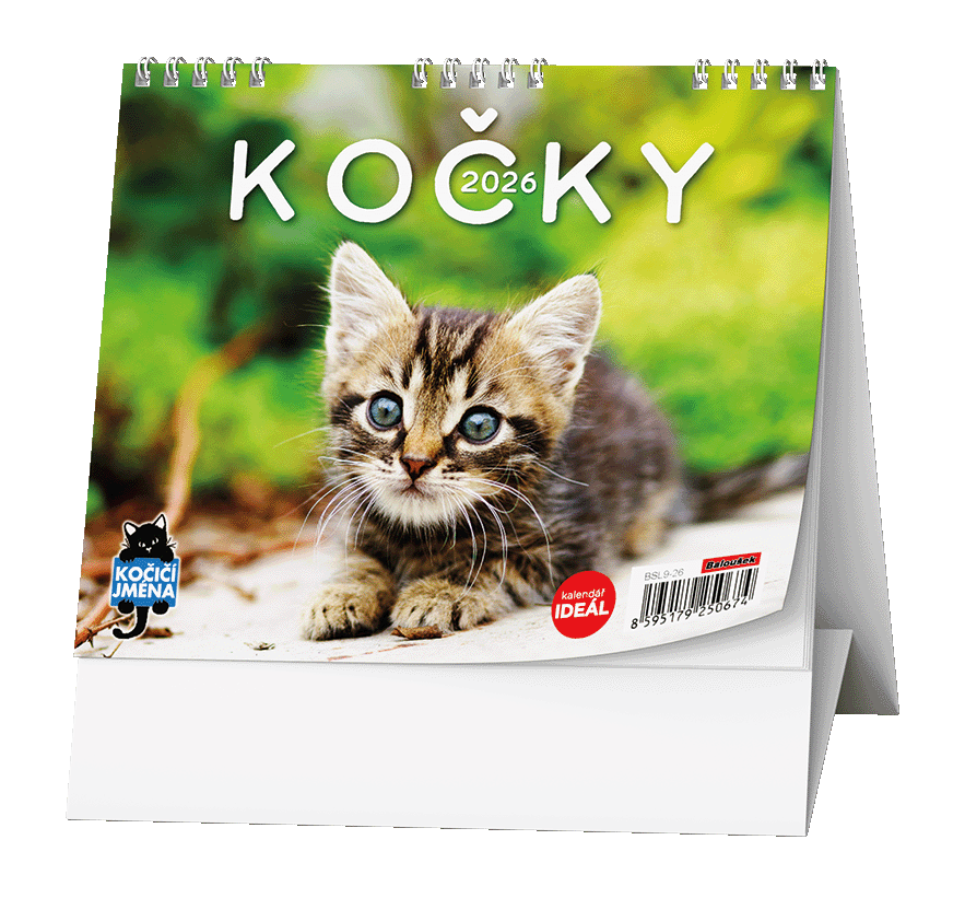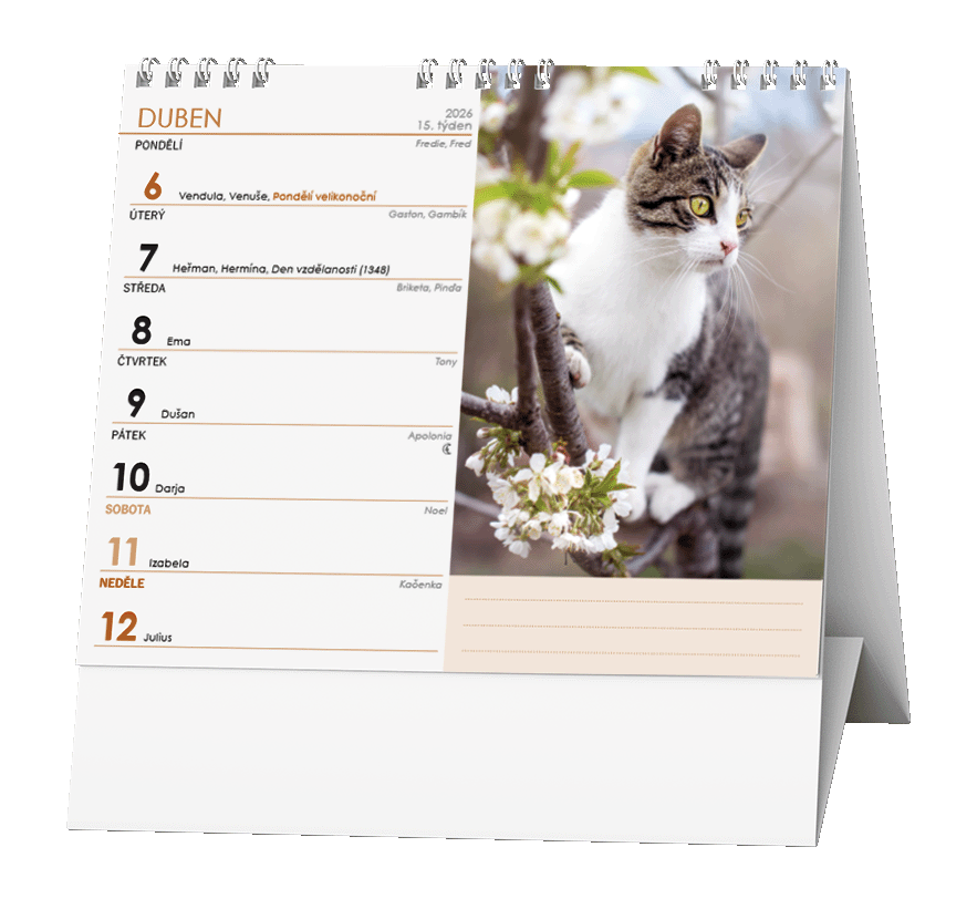 české týdenní jmenné kalendárium, s kočičími jmény, s obrázky koček, formát 16,5 x 13,5 cm