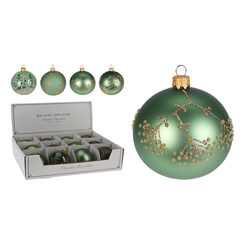 Vánoční skleněná koule 8 cm - ručně foukaná, zelená ve 4 designech